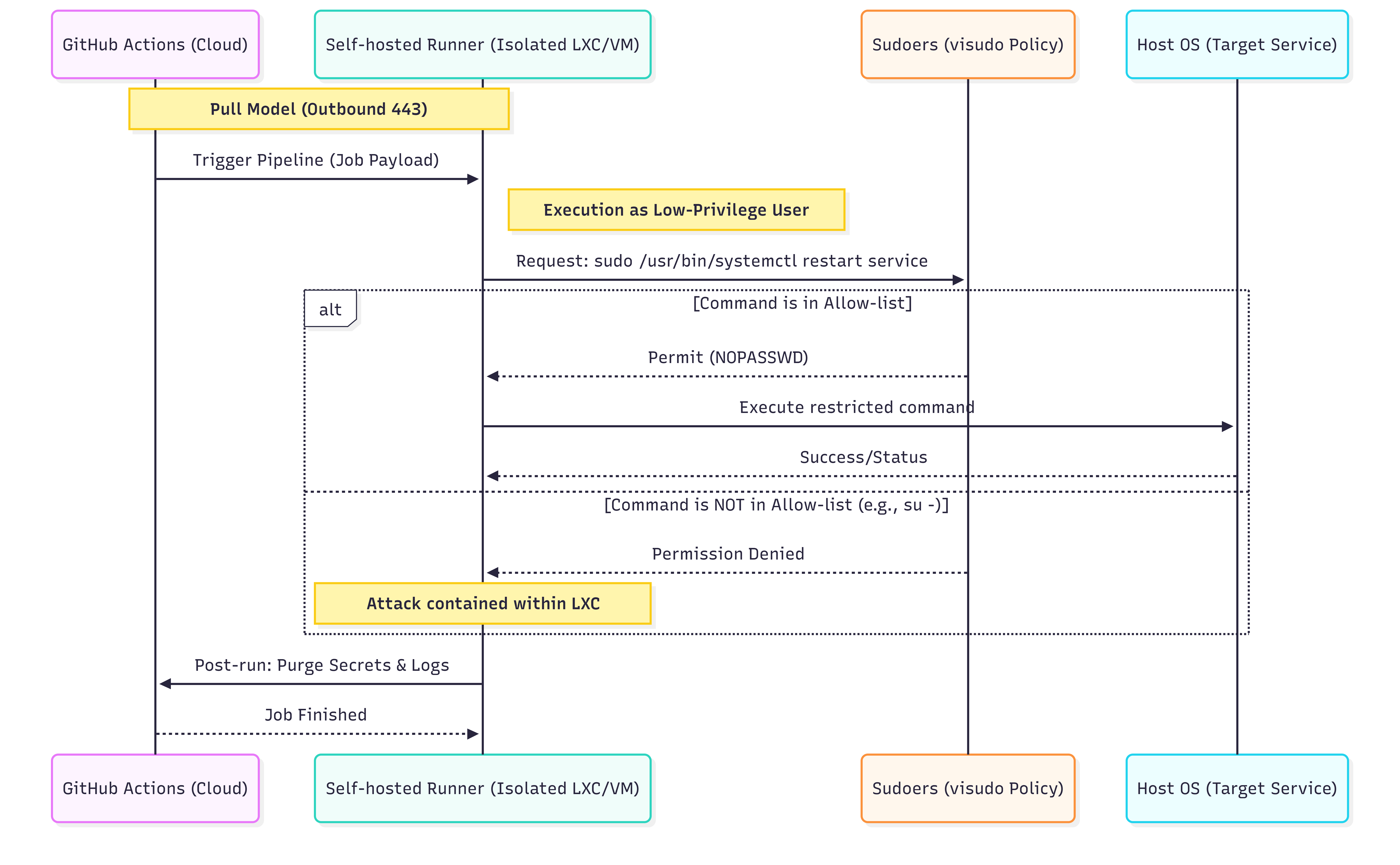 This strategy, which I have implemented to secure multi-tenant platforms, ensures that the runner operates under the Principle of Least Privilege (PoLP). When combined with LXC or VM isolation, this creates a multi-layered defense that protects the core infrastructure while maintaining deployment agility.