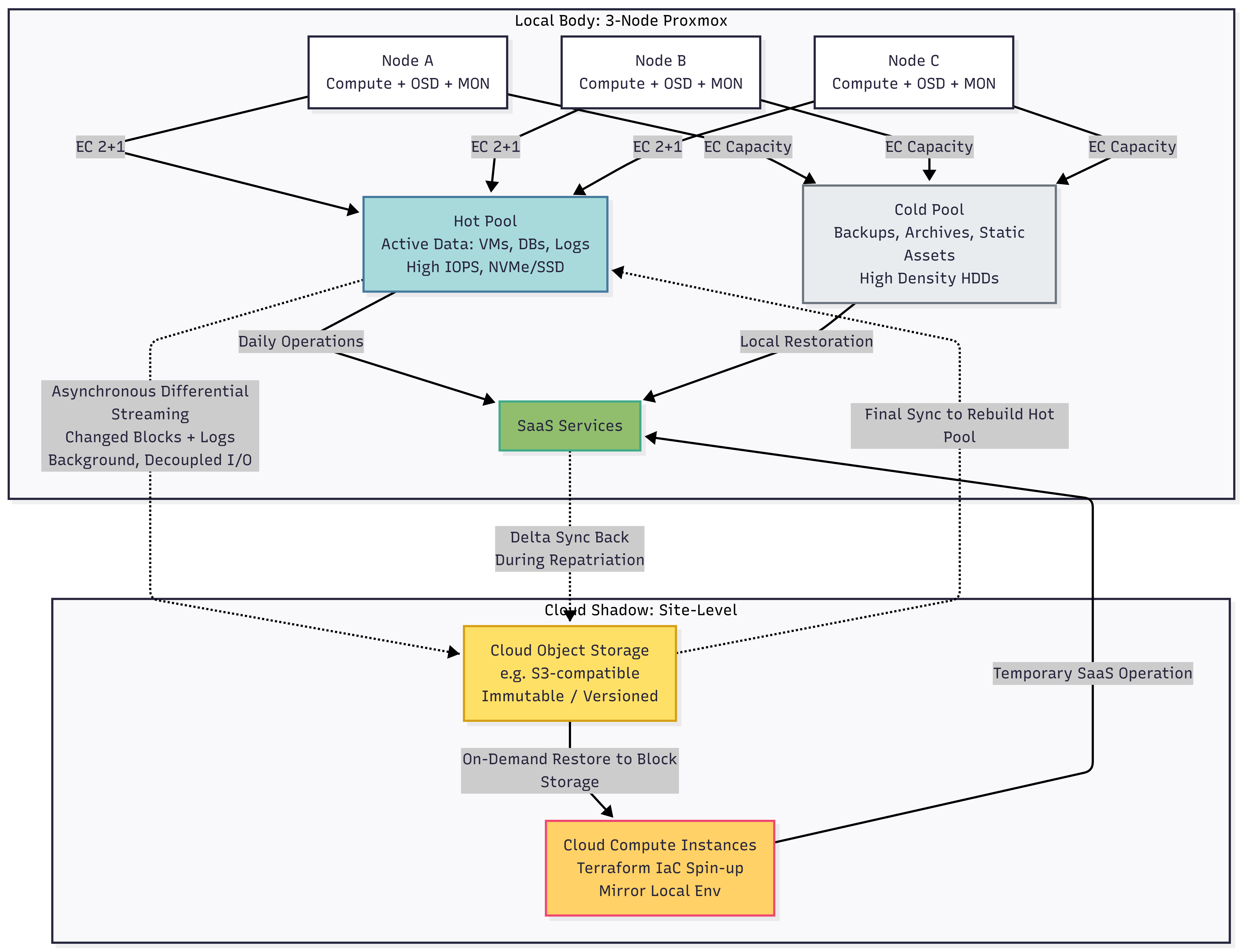 By combining a 3-node Proxmox + Ceph HCI with cloud shadowing, this architecture achieves a “self-healing” 2+1 redundancy where 66% of the hardware sustains full service operation. It eliminates single points of failure by treating hardware as disposable commodity parts, utilizing an EC-based Hot Pool for live business data and a capacity-focused Cold Pool for local archives, while ensuring total site survival through an asynchronous cloud failover and repatriation loop.