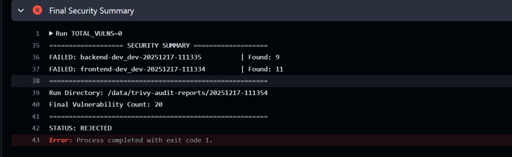 This enforcement acts as a hard stop. When Trivy detects vulnerabilities in an image, the pipeline fails immediately, preventing the compromised artifact from progressing to deployment. This ensures that only secure, verified components reach production.